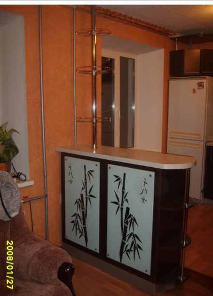 Практичная барная стойка замечательно поместилась на маленькой кухне и соединила гостевую комнату с кухней. Короб барной стойки изготовлен из ЛДСП,столешница влагостойкая в пластике . Под столешницей разместилась микроволновая печь и два ящика, а рядом раскладной столик. В раскрытом виде размер столика 1800*700*750. С лицевой стороны стойки размещаются стеклянные панели с рисунком.