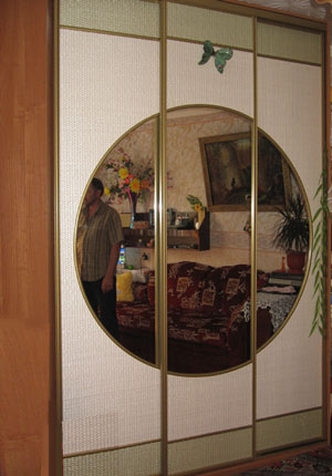 Габариты, мм: 2400х2100 Профиль «Найди» сталь крашенная, гнутый Наполнение дверей: Раттан, зеркало серебро Примерная стоимость 75 000 руб.