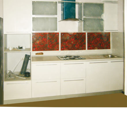 Кухня по индивидуальному заказу. Материалы: короб-ЛДСП серый; фасады-МДФ крашеные белые; столешница ДСП с влагостойкой пропиткой в пластике; стеновая панель со стеклом. На стекле сольвентная печать с изображением роз. Стоимость кухонного гарнитура - 69000 руб.